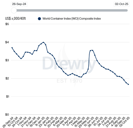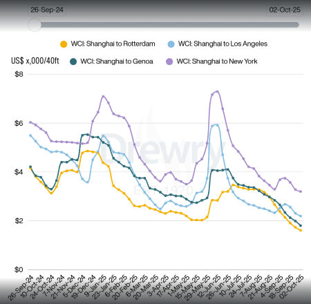 L’andamento dei noli marittimi evidenzia che al 2 ottobre 2025 il WCI, riferito ai contaneir di 40 piedi, è stato pari a 1.669 $, registrando una riduzione del 5% rispetto alla settimana precedente ed una riduzione del 52% rispetto al valore misurato nella stessa settimana del 2024. Nell’ultima settimana sulle principali tratte le tariffe dei noli sono leggermente diminuite; si sono, poi, registrate contrazioni per gli andamenti annuali sulle rotte Shanghai-Rotterdam, Shanghai-Los Angeles, Shanghai-Genoa, Rotterdam-Shanghai rispettivamente del 58%, 58%, 53% e 22%. (Link) |