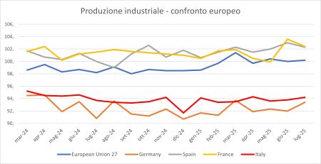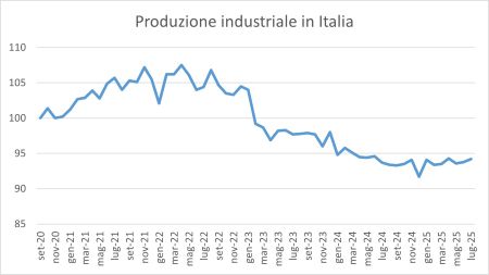 A luglio 2025 l’Istat ha stimato che l’indice destagionalizzato della produzione industriale sia aumentato dello 0,4% rispetto a giugno. Nella media del periodo maggio-luglio si è registrato un aumento del livello della produzione dello 0,2% rispetto ai tre mesi precedenti. L’indice destagionalizzato ha mostrato un calo congiunturale solo per l’energia (-7,8%); viceversa si sono osservati aumenti per i beni di consumo (+2,1%), i beni strumentali (+1,6%) e i beni intermedi (+0,7%).