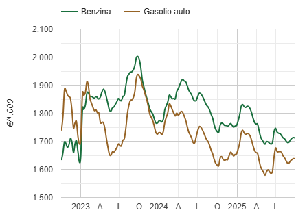 Il prezzo medio del gasolio nella settimana compresa tra il 22 e 28 settembre 2025 è stato di 1.637,71 di cui: accise 632,40 e IVA 295,32, registrando un aumento dello 0,64% rispetto alla settimana precedente. (Link) |