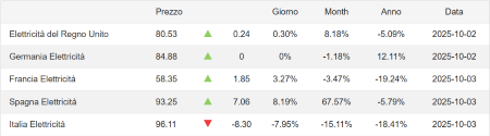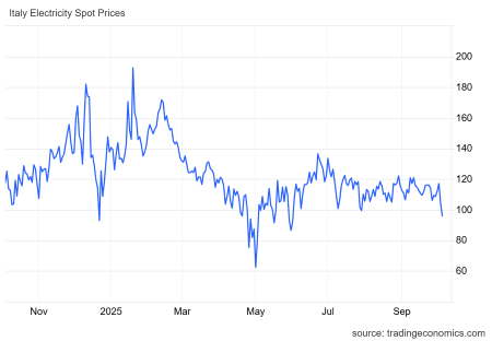 L'elettricità in Italia ha raggiunto il valore di 96,11 euro/MWh il 3 ottobre 2025, riducendosi del 15,11% rispetto al mese precedente e del 18,41% rispetto allo stesso periodo del 2024. (Link) |
