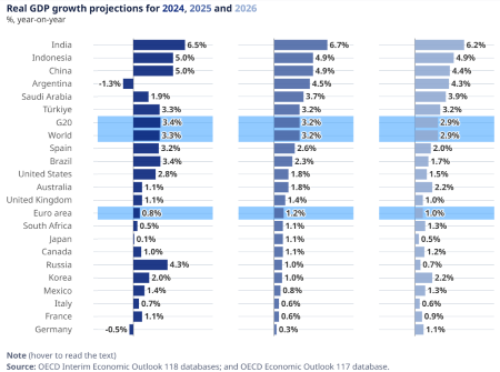 L’OECD ha stimato un rallentamento della crescita mondiale del PIL che dovrebbe passare dal 3,3% del 2024 al 3,2% nel 2025 ed al 2,9% nel 2026. Nella zona euro la crescita del PIL dovrebbe attestarsi all’1,2% nel 2025 (0,6% per l’Italia) e all’1,0% nel 2026 (0,6% per l’Italia). (Link) |