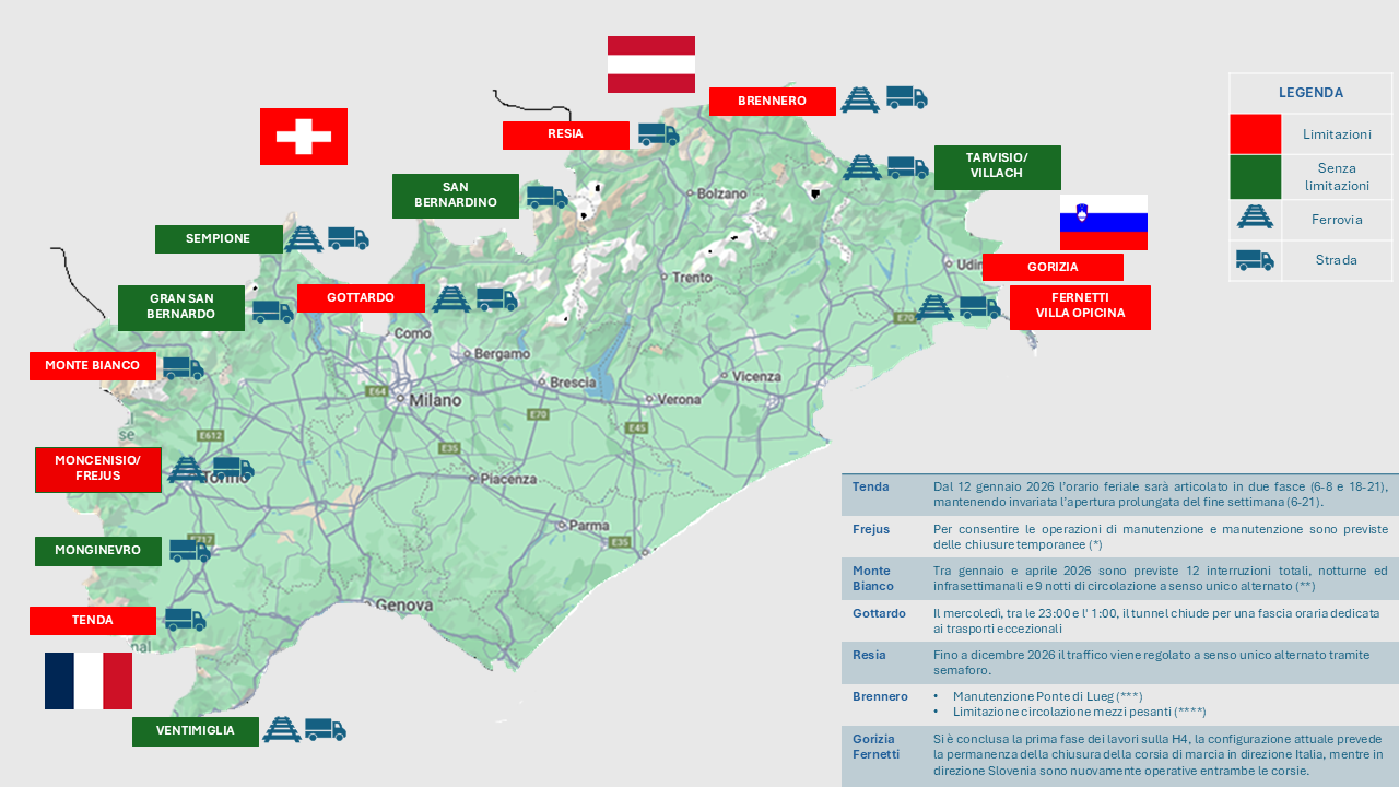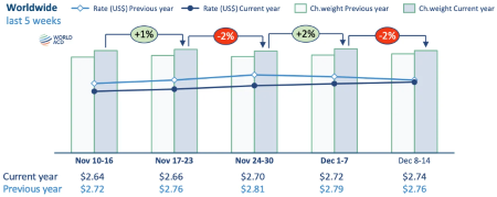 Il trasporto aereo mondiale di merci è aumentato del 4% nel 2025 rispetto al 2024 (anno in cui si sono registrati incrementi dell'11%). E' diminuito leggermente nella seconda settimana di dicembre dopo aver raggiunto il picco, all'inizio di dicembre, di circa +5% rispetto all'anno precedente. Le tariffe medie mondiali, basate su un mix di prezzi spot e tariffe contrattuali, sono diminuite di circa l'1% rispetto allo stesso periodo del 2024 ed aumentate rispetto alla settimana precedente dell'1% raggiungendo i 2,74 $/kg. (Link) |