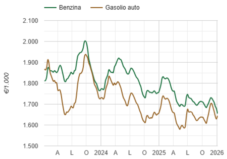 Il prezzo medio del gasolio nella settimana compresa tra il 29 dicembre 2025 e il 4 gennaio 2026 è stato di 1644,17 di cui: accise 672,90 e IVA 296,49, registrando un aumento del 15,47% rispetto alla settimana precedente ed un aumento dell’1,7% rispetto allo stesso periodo del 2025. (Link) |