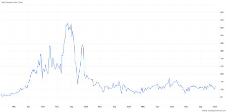 L'elettricità in Italia ha raggiunto il valore di 120.96 euro/MWh il 7 gennaio 2026, aumentando del 14,40% rispetto al mese precedente e diminuendo del 9,21% rispetto allo stesso periodo del 2025. (Link) |