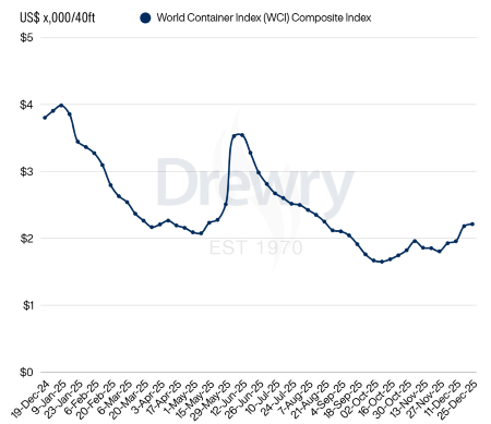 L’andamento dei noli marittimi evidenzia che al 25 dicembre 2025 il WCI, riferito ai contaner di 40 piedi, è stato pari a 2.213 $, registrando un incremento dell’1% rispetto alla settimana precedente ed una riduzione del 42% rispetto al valore misurato nella stessa settimana del 2024. Nell’ultima settimana sulle principali tratte le tariffe dei noli sono leggermente aumentate sulle rotte Cina-Europa e rimaste stazionarie su quelle Cina-USA. (Link) |