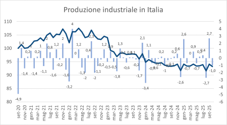 A ottobre 2025 l’Istat ha stimato che l’indice destagionalizzato della produzione industriale sia diminuito dell’1,0% rispetto a settembre. Nella media del trimestre agosto-ottobre 2025 si è registrata una riduzione del livello della produzione dello 0,9% rispetto ai tre mesi precedenti.