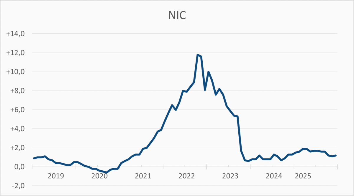 A dicembre 2025 l’indice del clima di fiducia delle imprese è aumentato da 96,1 a 96,5. La fiducia è migliorata nei sevizi di mercato, è rimasta stabile nel commercio al dettaglio ed è diminuita nei comparti dell’industria e delle costruzioni. (Link) |