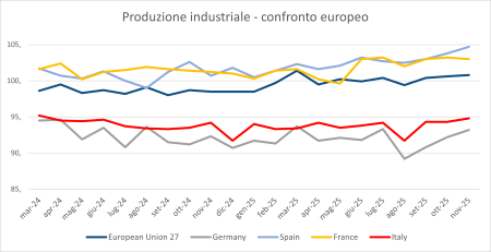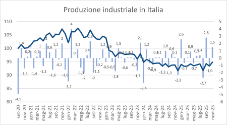 A novembre 2025 l’Istat ha stimato che l’indice destagionalizzato della produzione industriale sia aumentato dell’1,5% rispetto a ottobre. Nella media del trimestre settembre-novembre il livello della produzione è cresciuto dell’1,1% rispetto ai tre mesi precedenti.