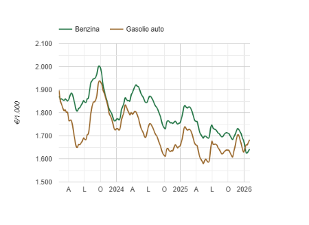 Il prezzo medio del gasolio nella settimana compresa tra il 26 gennaio e l’1 febbraio 2026 è stato di 1681,86 di cui: accise 672,90 e IVA 303,29, registrando un aumento del 8,39% rispetto alla settimana precedente ed una riduzione dell’11,3% rispetto allo stesso periodo del 2025. (Link) |