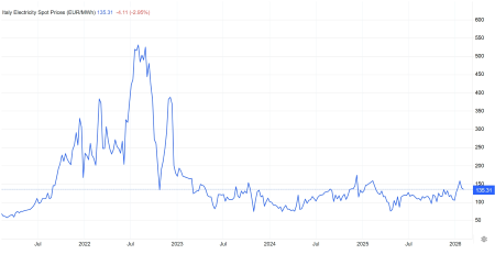 L'elettricità in Italia ha raggiunto il valore di 135,31 euro/MWh il 4 febbraio 2026, aumentando del 10,35% rispetto al mese precedente e diminuendo del 9,63% rispetto allo stesso periodo del 2025. (Link) |