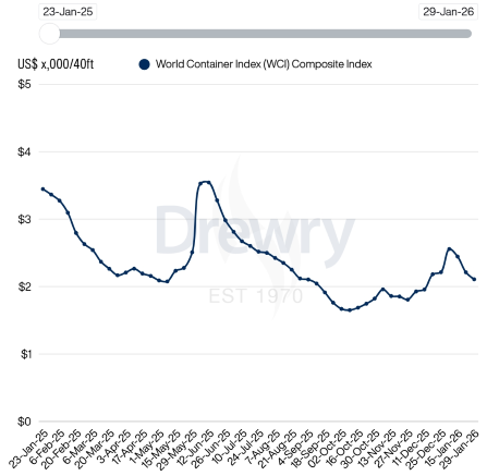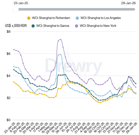 L’andamento dei noli marittimi evidenzia che al 29 gennaio 2026 il WCI, riferito ai contaneir di 40 piedi, è stato pari a 2.107 $, registrando una riduzione del 5% rispetto alla settimana precedente del 37% rispetto al valore misurato nella stessa settimana del 2025. Nell’ultima settimana sulle principali tratte le tariffe dei noli sono diminuite su tutte le rotte ad eccezione della Rotterdam – Shanghai che è rimasta stazionaria. (Link) |