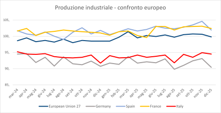A dicembre 2025 l’Istat ha stimato che l’indice destagionalizzato della produzione industriale sia diminuito dello 0,4% rispetto a ottobre. Nella media del quarto trimestre il livello della produzione è cresciuto dello 0,9% rispetto ai tre mesi precedenti.