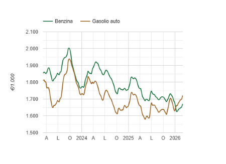 Il prezzo medio del gasolio nella settimana compresa tra il 23 febbraio e l’1 marzo 2026 è stato di 1720,69 di cui: accise 672,90 e IVA 310,29, registrando un aumento del 18,86% rispetto alla settimana precedente ed una riduzione del 5,1% rispetto allo stesso periodo del 2025. (Link) |