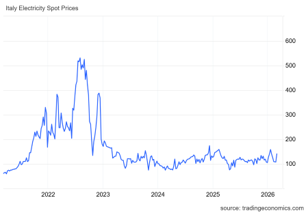 L'elettricità in Italia ha raggiunto il valore di 140,59 euro/MWh il 6 marzo 2026, aumentando del 2,74% rispetto al mese precedente e del 13,07% rispetto allo stesso periodo del 2025. (Link) |