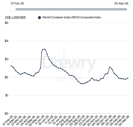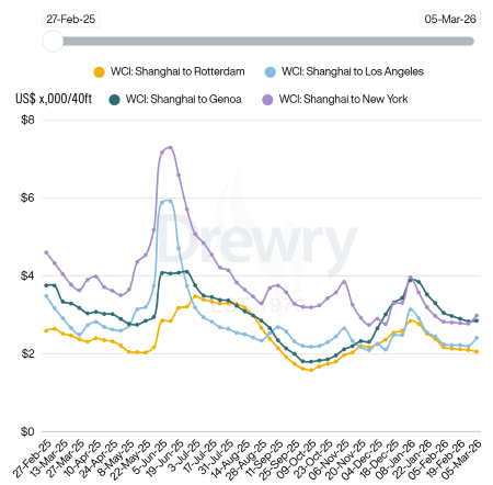 L’andamento dei noli marittimi evidenzia che al 5 febbraio 2026 il WCI, riferito ai contaneir di 40 piedi, è stato pari a 1.958$ (2.844$ sulla rotta Shanghai – Genoa), registrando un aumento del 3% rispetto alla settimana precedente ed una riduzione del 23% rispetto al valore misurato nella stessa settimana del 2025. Nell’ultima settimana sulle principali tratte le tariffe dei noli sono rimaste tendenzialmente stabili ad eccezione della Shanghai - Los Angeles che è aumentata del 10%. (Link) |
