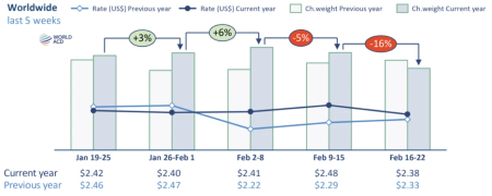 Il trasporto aereo mondiale di merci è diminuito del 16% nella settimana compresa tra il 16 ed il 22 febbraio 2026 rispetto alla precedente. Le tariffe medie mondiali, basate su un mix di prezzi spot e tariffe contrattuali, sono aumentate del 2% rispetto allo stesso periodo del 2025 e diminuite del 4% rispetto alla settimana precedente raggiungendo i 2,38 $/kg. (Link) |